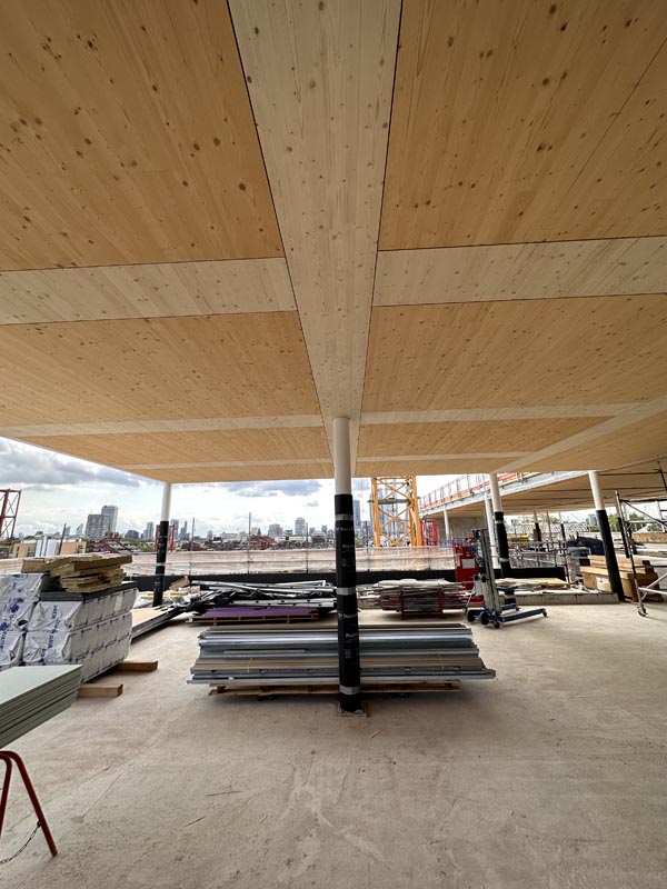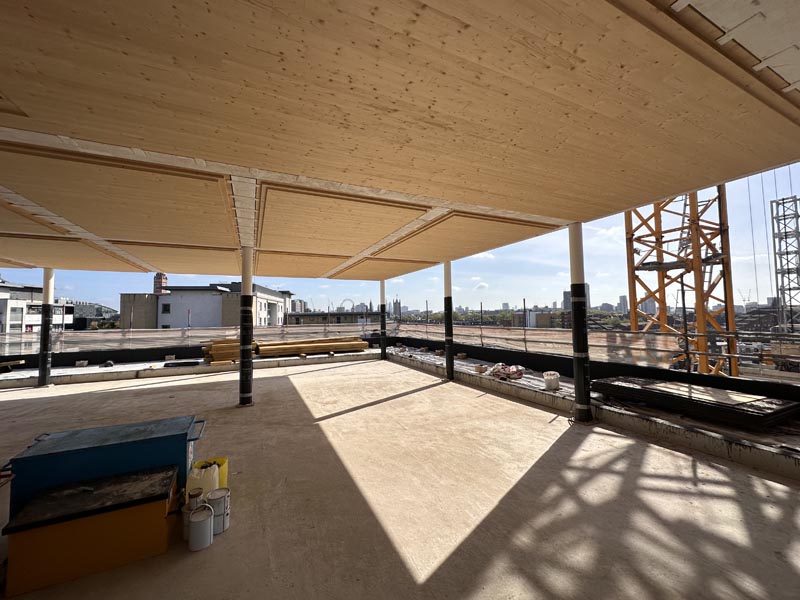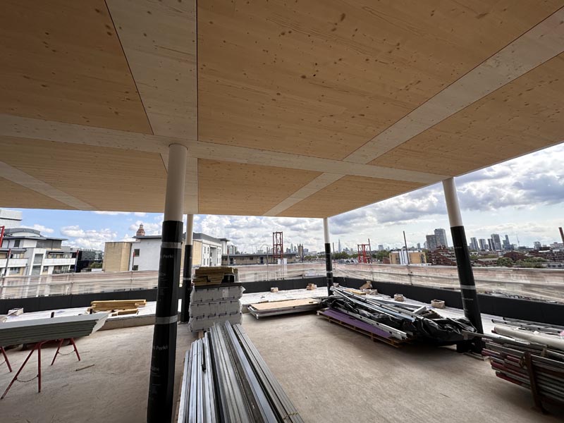 The renewal and extension of this 1950s central London office block features a new rooftop pavilion formed of a hybrid steel frame with CLT infill panels designed, supplied and installed by G-frame Structures. Once complete the scheme will provide 108,000 sq ft of net zero carbon office accommodation providing exceptional facilities for incoming tenants. It surpasses the RIBA 2030 Climate Challenge net zero target by 38%, has achieved WiredScore Platinum Certification, the SmartScore Platinum target and aims for a rating of BREEAM ‘Outstanding.’