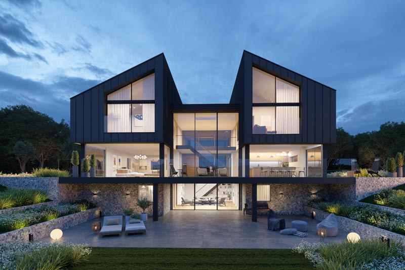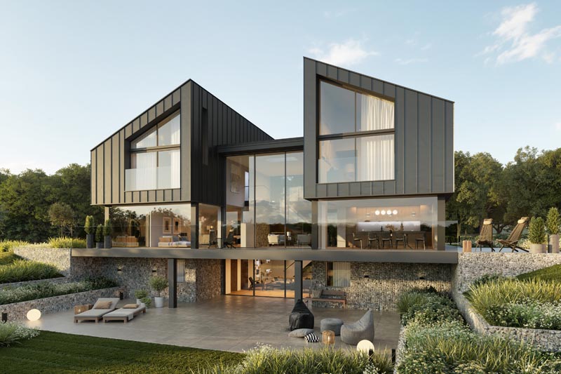 A contemporary new family home in the Sussex countryside. The two-storey building is formed of a CLT structure with steel supporting elements. The two portal frame design helps to stabilise the building which features large double glazed windows at the rear that make the most of the stunning views of the surrounding landscape. A basement runs beneath the entire footprint of the building providing the foundation to the structure.