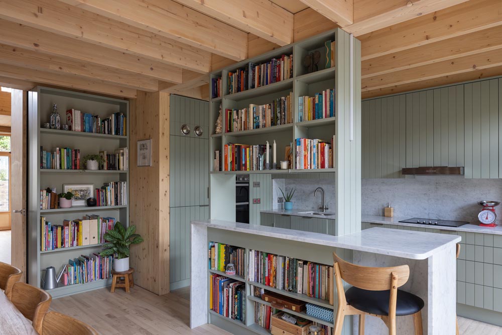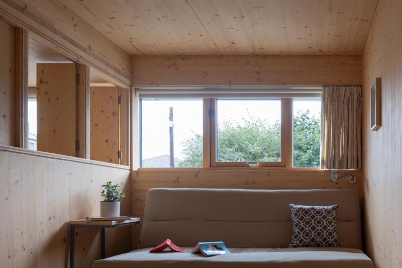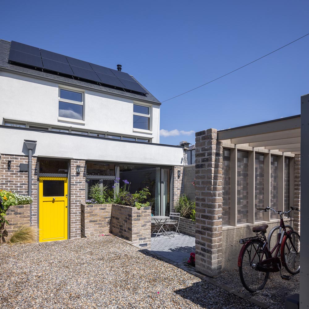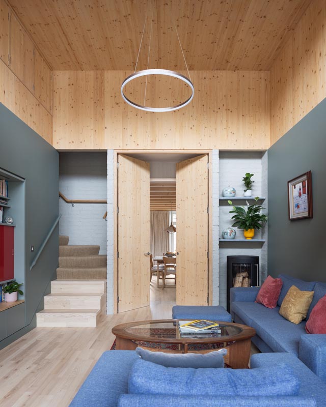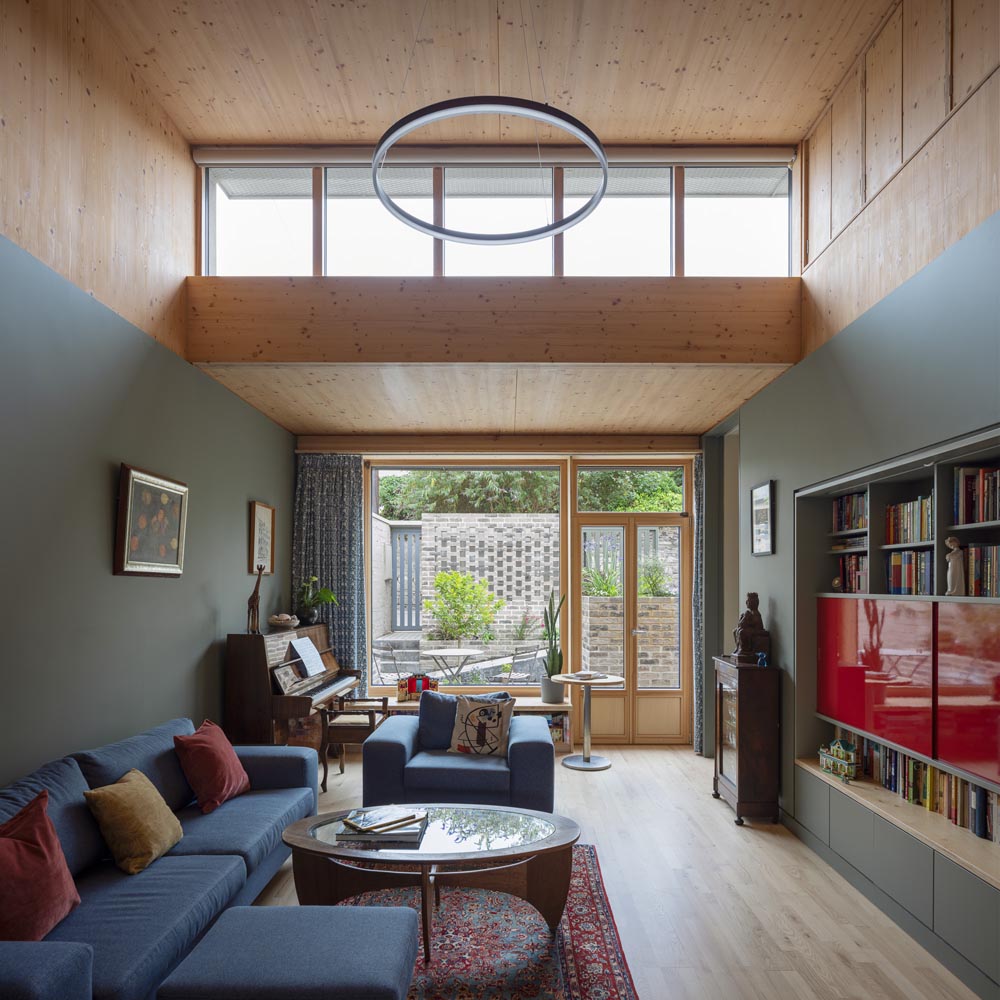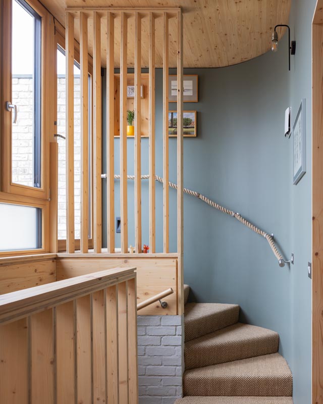 Teach Spruis (Spruce House) is a two and a half storey terrace house built on an extremely tight site in Central Dublin. The family home is designed to achieve Passive House standards and is one of the first residential buildings in Ireland to use Cross Laminated Timber (CLT) for the entire superstructure. Living space on the small footprint is maximized space with ground the floor arranged around a double-height central space at the front and kitchen/dining room to the rear. Three bedrooms and a mezzanine study are on three upper half-floors which are stepped around a central stairs and additional half-storey runs. Three outdoor spaces including an upper terrace frame views and act as outdoor rooms.