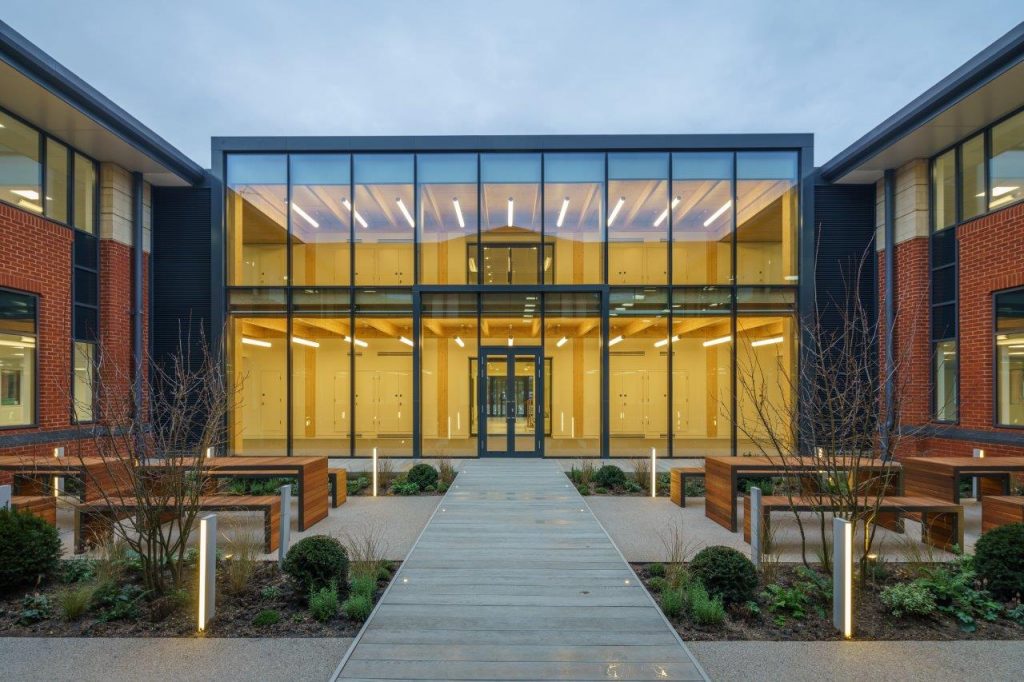G-frame were responsible for the design, supply and installation of the superstructure which is formed of CLT with glulam columns and beams. Glazed curtain walling connects the new extension to the external courtyard creating a welcoming reception area and central hub. The site was subject to weight and access constraints with deliveries being made via an old railway bridge. Use of CLT helped to overcome these constraints due to its lightweight nature and reduced delivery requirements.